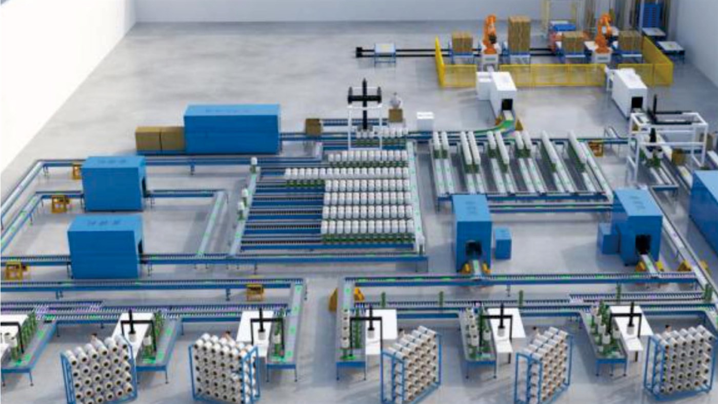 原丝输送 -> 自动分切分拣 -> 堆垛整理 -> 贴标打环 -> 智能套袋 -> 自动绑件打包 -> 缠绕机裹膜 -> 桁架机械手/码垛机器人精准码垛 -> 重载链条输送至成品仓储区