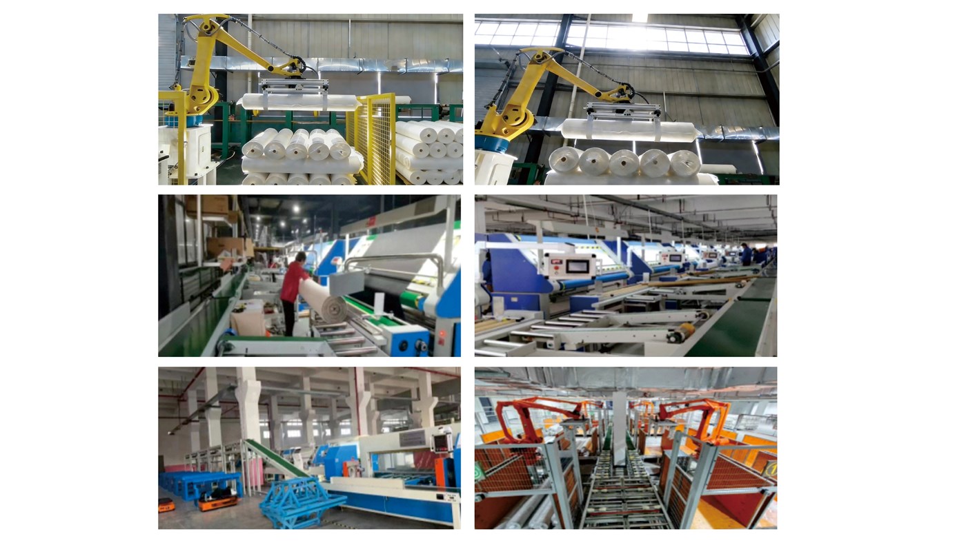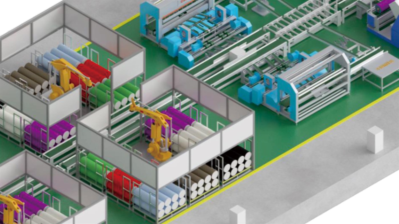 以全自动 PE 热缩包装机为核心,整合智能检验、自动化包装、精准分拣与智能搬运技术,适用于卷状布匹后段的标准化包装作业。