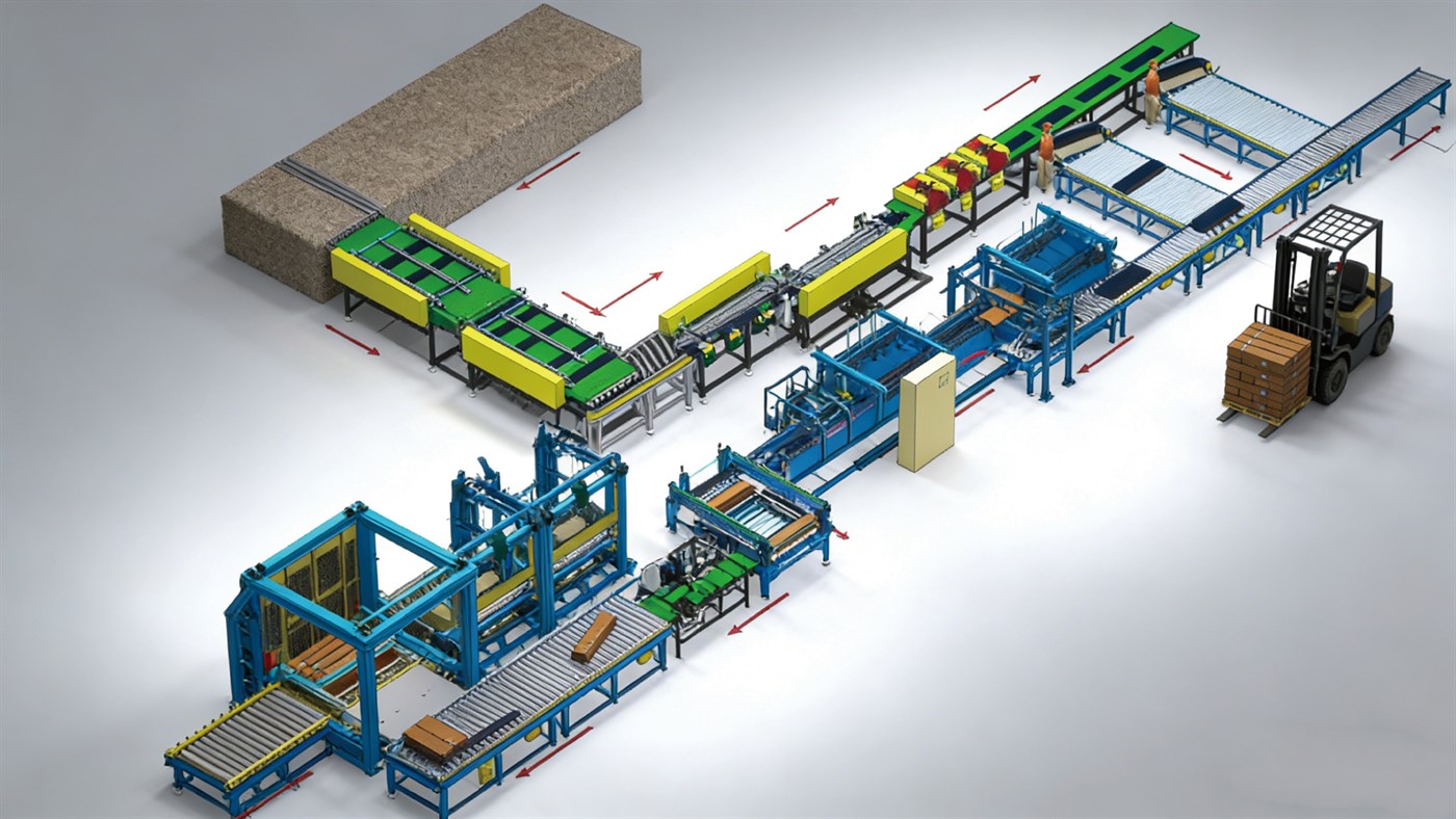 前段成品输送 -> 定尺分条 -> 精准裁切 -> 侧边定位整形 -> 自动堆叠 -> 贴标 -> 预折包装 -> 上盖整形 -> 转向码垛 -> 外箱/标识处理 -> 叉车转运仓储
