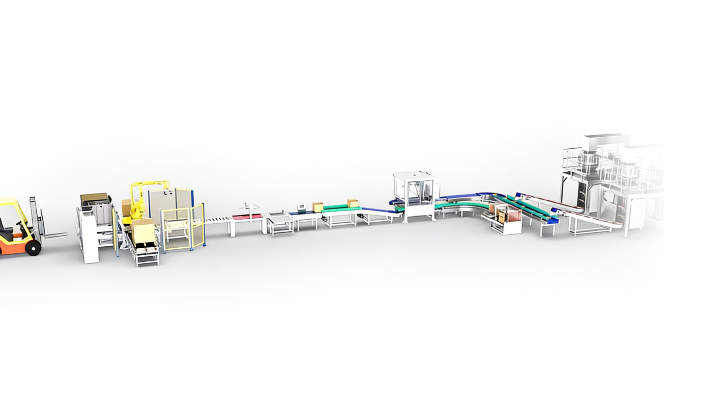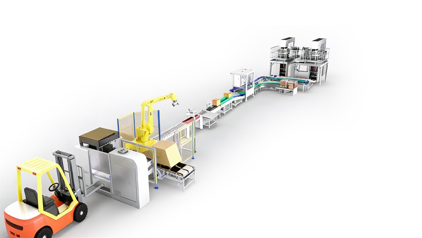 纸箱原料上料 -> 立式开箱机自动开箱成型 -> 顶面贴标 -> 机械手装箱 -> 侧面贴标 -> 边角封箱机预折+封箱 -> 成品箱流转